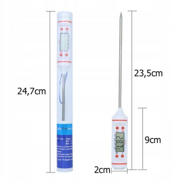 TERMOMETR CYFROWY LCD SONDA Zakres pomiaru temperatury: -50°C do 300°C Długość całkowita: 23.5cm Średnica szpikulca: 4 mm Długość szpikulca: 14,7 cm Zasilanie: 1xbateria 1,5V LR44 - w zestawie Dokładność: do 0,5°C ZESTAW... więcej...